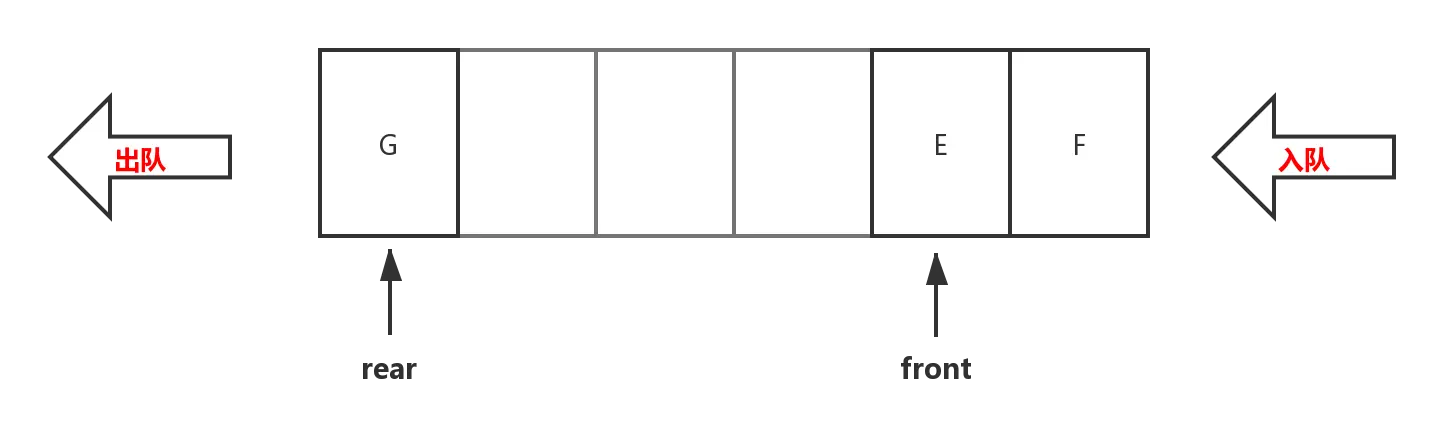 环绕式处理:为了避免队列不满却不能插入新数据项的问题,只要队头(front)或者队尾(rear)到达数组的边界,下次操作时让它重新回到数组的开头,这就是循环队列。如下图,原队尾指向数组边界数组F处,现在新增数据G,队尾指向了数组的头部,数据添加在数组下标为0的位置。