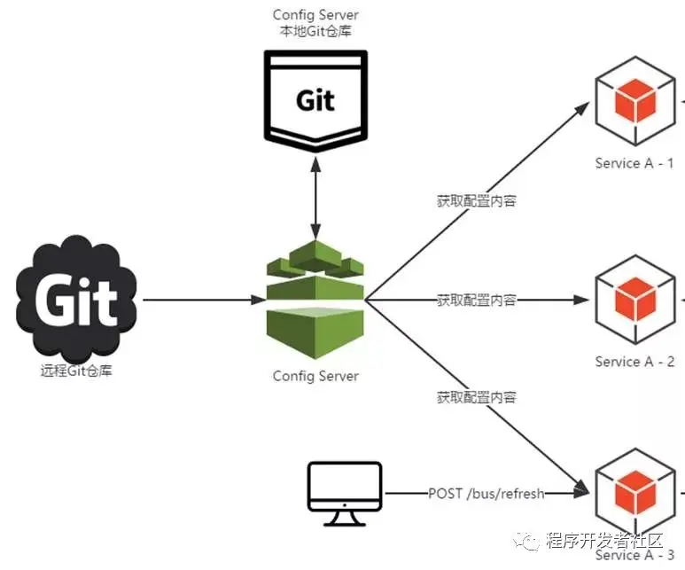 Spring Cloud Config是Spring Cloud团队创建的一个全新项目,用来为分布式系统中的基础设施和微服务应用提供集中化的外部配置支持,它分为服务端(config server)与客户端(config client)两个部分。其中服务端也称为分布式配置中心,它是一个独立的微服务应用,用来连接配置仓库并为客户端提供获取配置信息、加密/解密信息等访问接口,而客户端则是微服务架构中的各个微服务应用或基础设施,它们通过指定的配置中心来管理应用资源与业务相关的配置内容, 并在启动的时候从配置中心获取和加载配置信息。Spring Cloud Config实现了对服务端和客户端中环境变量和属性配置的抽象映射,所以它除了适用于Spring构建的应用程序之外, 也可以在任何其他语言运行的应用程序中使用。由于Spring Cloud Config实现的配置中心默认采用Git来存储配置信息,所以使用Spring Cloud Config构建的配置服务器,天然就支持对微服务应用配置信息的版本管理,并且可以通过Git客户端工具来方便地管理和访问配置内容。当然它也提供了对其他存储方式的支持,比如SVN仓库、本地化文件系统。