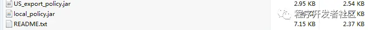 在使用 Spring Cloud Config的加密解密功能时,有一个必要的前提需要我们注意。为了启用该功能,我们需要在配置中心的运行环境中安装不限长度的JCE版本(Unlimited Strength Java Cryptography Extension)。虽然,JCE功能在JRE中自带,但是默认使用的是有长度限制的版本。我们可以从 Oracle的官方网站下载到它,它是一个压缩包,解压后可以看到下面三个文件: