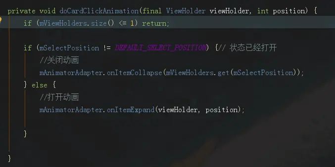 - viewHolder给卡片设置点击监听,点击后调用动画方法