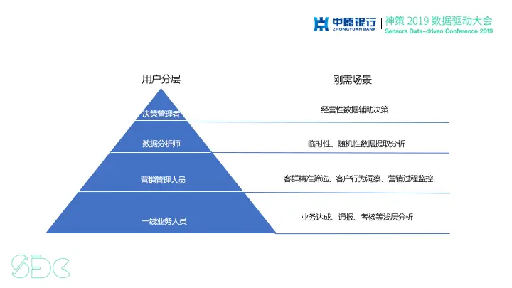 在不同场景下,每个人会面临不同的刚需。场景化思路,基于数据对用户进行精准分层,包含一线业务人员、营销管理人员、数据分析师、决策管理者等,最终让使用数据的人构成一个金字塔,且不同人对应的刚需场景明显不同,比如一线业务人员关心的更多是业务达成、通报、考核等浅层分析。如下图: