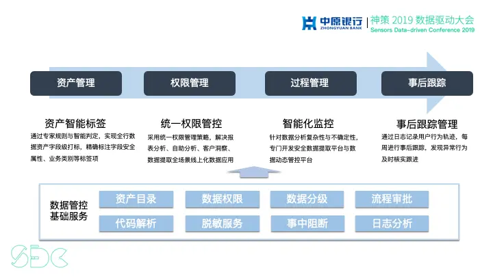 关于安全管控,对于银行来说,需解决事前、事中、事后问题。依托于数据安全管控能力,向全行用户开放数据平台,实现任意用户无门槛访问,实现功能按钮级、数据字段级等,如下图: