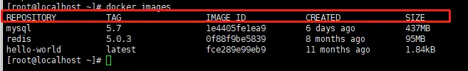 参数说明 1、REPOSITORY:表示镜像的仓库源 2、TAG:镜像的标签 3、IMAGE ID:镜像ID 4、CREATED:镜像创建时间 5、SIZE:镜像大小