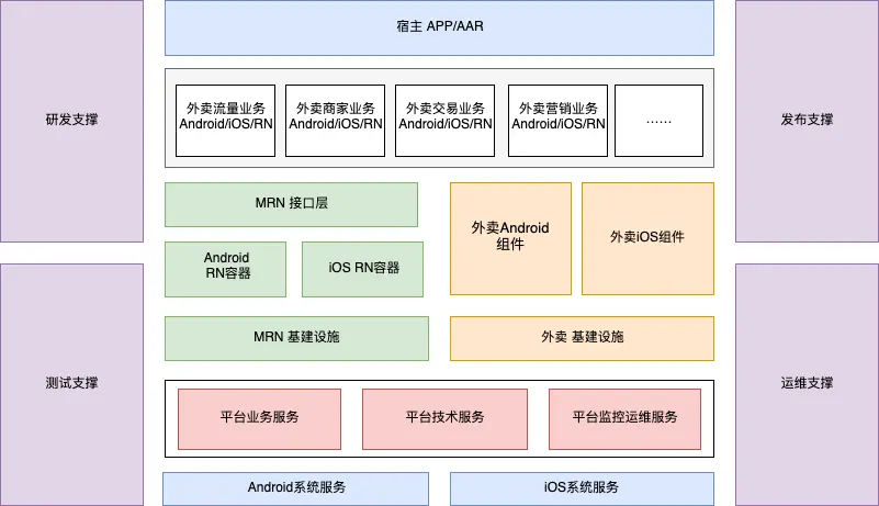 上图是外卖App引入MRN后的架构全景图,接下来我们会从下到上、从左到右逐步介绍: