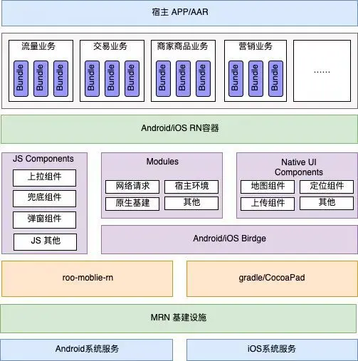- 再往上一层是MRN基建层,这一层的工作主要是:(1)尽可能地屏蔽Android和iOS系统的差异性;(2)打通已有的平台基建能力,让上层业务不能感知到差异。
