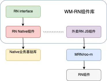 上图是我们外卖组件库的架构图,最底层依赖Android和iOS的原生服务;然后是MRN基建层,用于抹平Android和iOS系统之间的差异;再上一层则是外卖组件库及其依赖,如平台组件库和打包服务,组件库分为两类:纯JS组件和包含JS和Native的复合组件。再上一层则是Android和iOS的MRN容器,它提供了上层Bundle的运行环境。整个组件的架构思路,是利用中间层来屏蔽平台的差异,尽可能地使用JS组件,减少对原生组件的依赖。这样可以有效地减少上层业务开发时对平台的理解。接下来,我们主要讲一下WM-RN组件库: