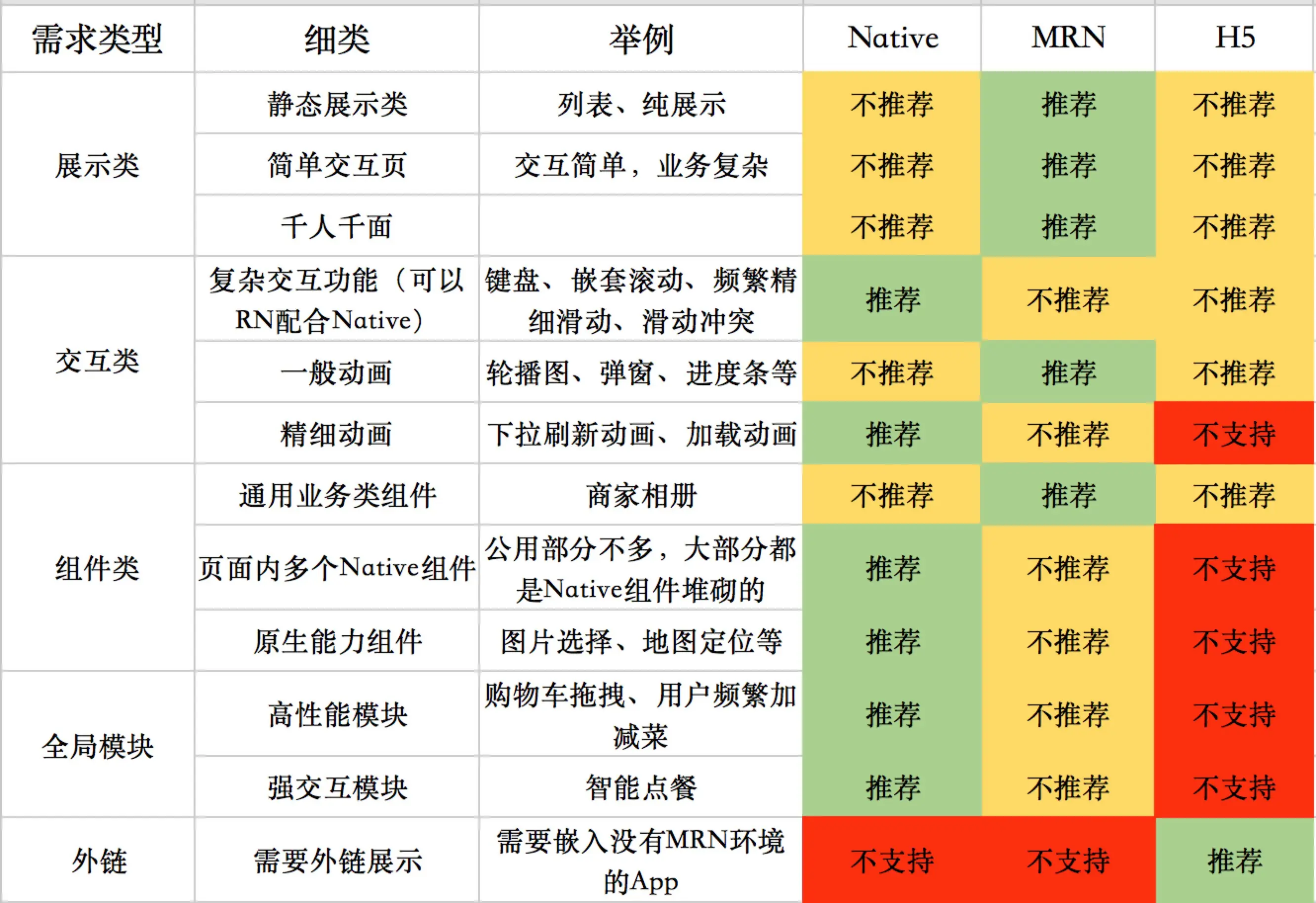 目前,美团外卖App存在三种技术栈:Native、MRN、H5,面对业务持续增长和安装包不断变大的压力,选择合适的技术栈显得尤为重要。H5在性能和用户体验方面相比Native和基于Native渲染的RN相对弱一些,所以目前大部分H5页面只是用来承载需求变更频繁、需要即时上线的活动页面。那么MRN和Native的界限是什么呢?当有一个新的页面产生时,我们应该如何做取舍?通过实践,我们逐渐摸索了一套选型规则,如下: