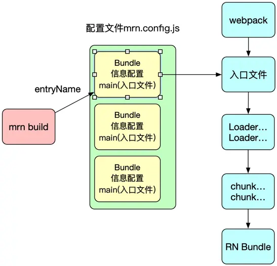 通过分析MRN的打包原理可知,MRN通过一个配置文件配置了一个Bundle的所有业务信息以及mrn-pack2的打包入口。所以我们只需要让配置文件支持多份Bundle信息的配置,通过打包命令与参数选择正确的mrn-pack2打包入口,即可打出我们最终所需要的业务Bundle。如下图所示: