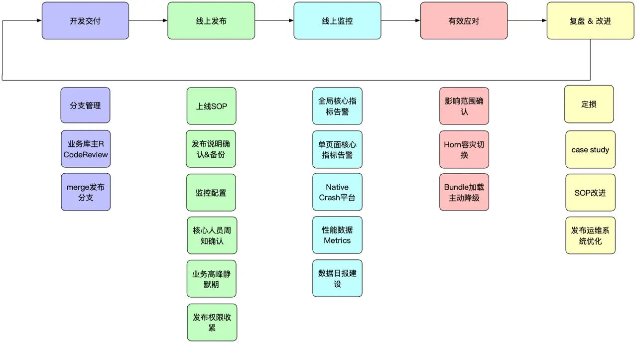 下图展示了我们的发布运维全景,共覆盖了开发交付、线上发布、线上监控、有效应对、复盘改进等五大模块。接下来我们会逐一进行介绍。