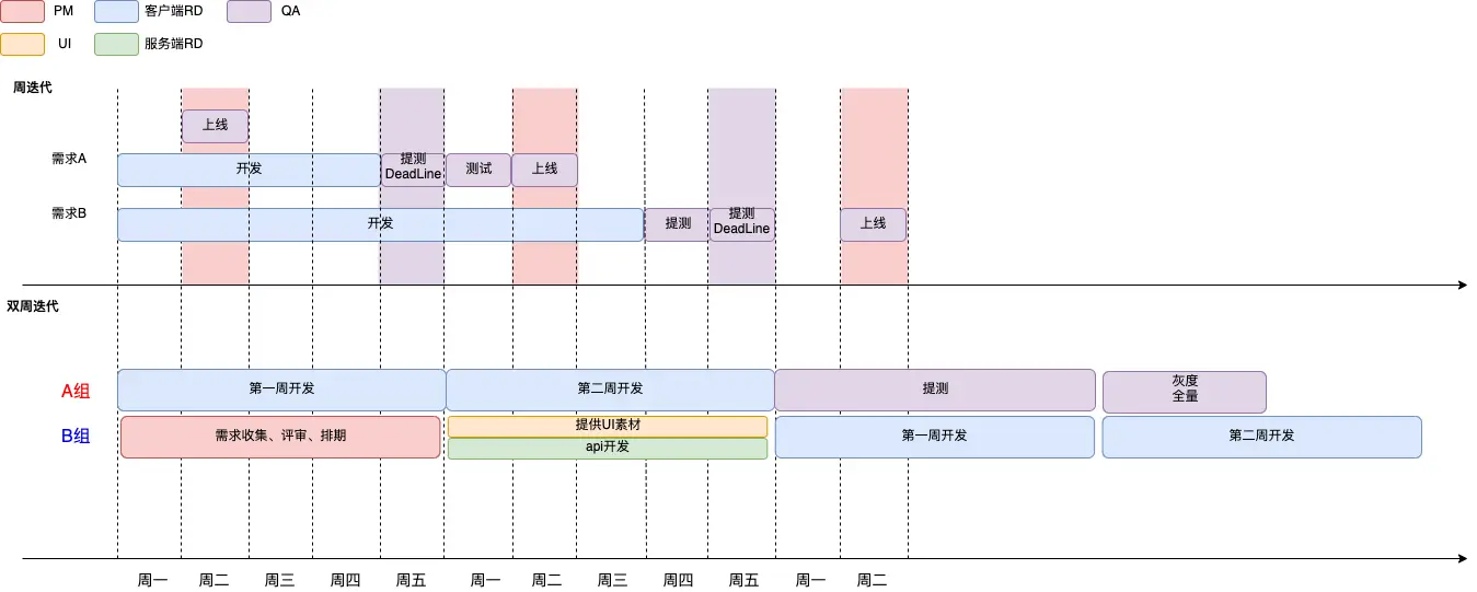 客户端以周维度进行开发,每周确定下周可提测的内容,根据提测内容是否为动态化的业务、下周是否在版本迭代周期内,决定跟版发布或周发布。