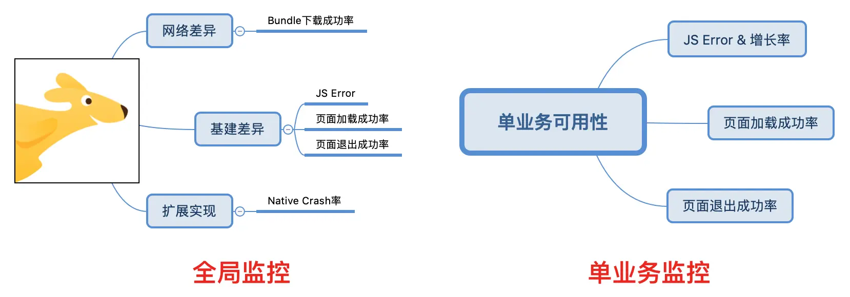 外卖App经过多年的发展,目前已逐渐成为一个平台级应用,承接了C端、闪购、跑腿等多个业务。与美团App相比,它们之间在很多基础建设、扩展、网络部分都存在差异。所以在监控核心指标的选取上,我们除了保证C端MRN业务在美团以及外卖两端的高可用性,还需要保证外卖App平台本身基建的稳定性,从而保证运转在外卖App上所有MRN业务的高可用性。