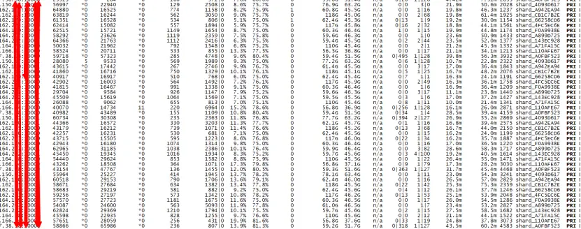 线上某集群峰值TPS超过100万/秒左右(主要为写流量,读流量很低),峰值tps几乎已经到达集群上限,同时平均时延也超过100ms,随着读写流量的进一步增加,时延抖动严重影响业务可用性。该集群采用mongodb天然的分片模式架构,数据均衡的分布于各个分片中,添加片键启用分片功能后实现完美的负载均衡。集群每个节点流量监控如下图所示: