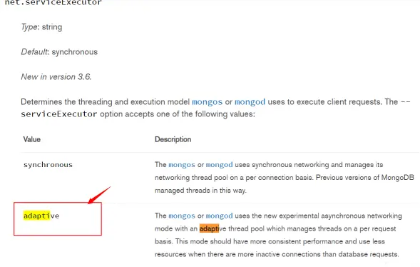 为了适应高并发的读写场景,mongodb-3.6开始引入serviceExecutor: adaptive配置,该配置根据请求数动态调整网络线程数,并尽量做到网络IO复用来降低线程创建消耗引起的系统高负载问题。此外,加上serviceExecutor: adaptive配置后,借助boost:asio网络模块实现网络IO复用,同时实现网络IO和磁盘IO分离。这样高并发情况下,通过网络链接IO复用和mongodb的锁操作来控制磁盘IO访问线程数,最终降低了大量线程创建和消耗带来的高系统负载,最终通过该方式提升高并发读写性能。