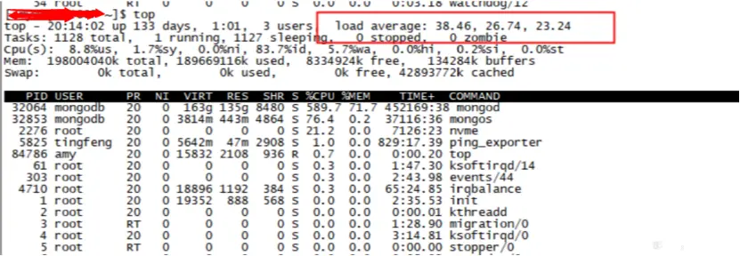 此外,查看该机器的内存,可以看到内存总大小为190G,其中已经使用110G左右,几乎是mongod的存储引起占用,这样会造成内核态的page cache减少,大量写入的时候内核cache不足就会引起磁盘缺页中断,引起大量的写盘。