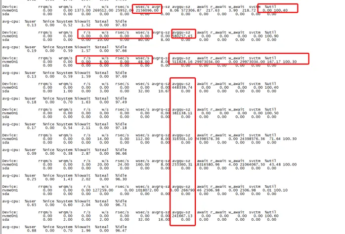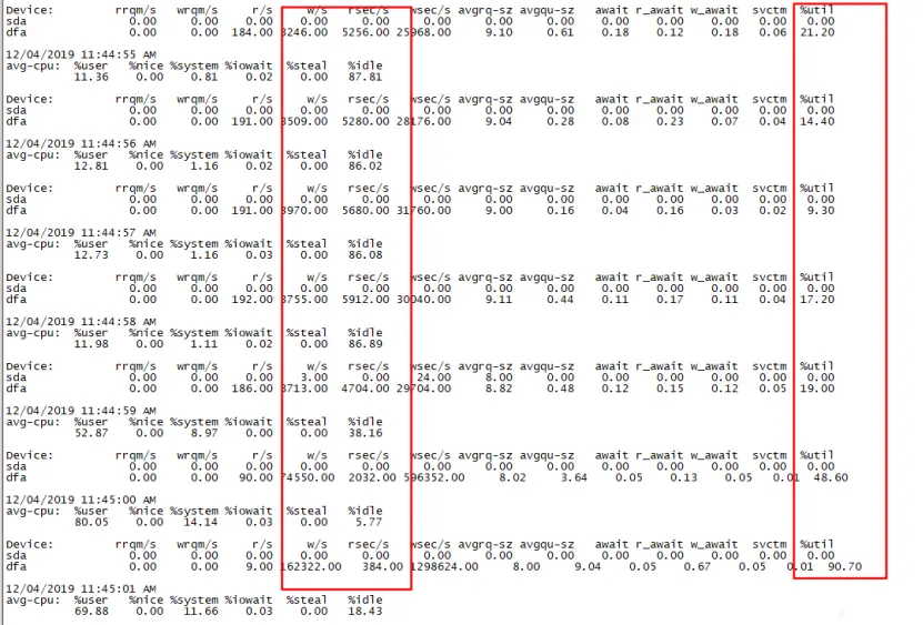 此外,在大量写入IO后很长一段时间util又持续为0%,现象如下: