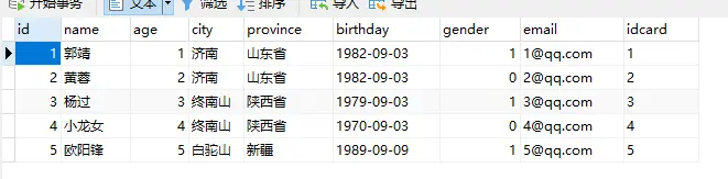 INSERT INTO `student`(id,name,idcard,age,city,province,birthday,gender,email) VALUES ('5', '欧阳锋', '5', '5', '白驼山', '新疆', '1989-09-09', 1, '5@qq.com');