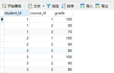SELECT student.name,course.name,score.grade FROM student,course,score