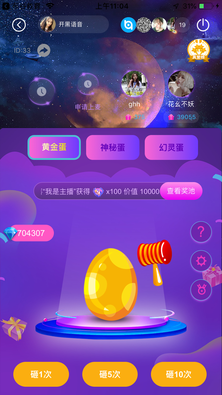 游戏:砸金蛋房主和平台都可分成盈利,打泡泡,可查看中奖榜单