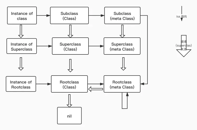 isa指向 : 对象的isa 指向的是当前类,类指向的是元类,元类指向的根源类,根源类指向自己的本身