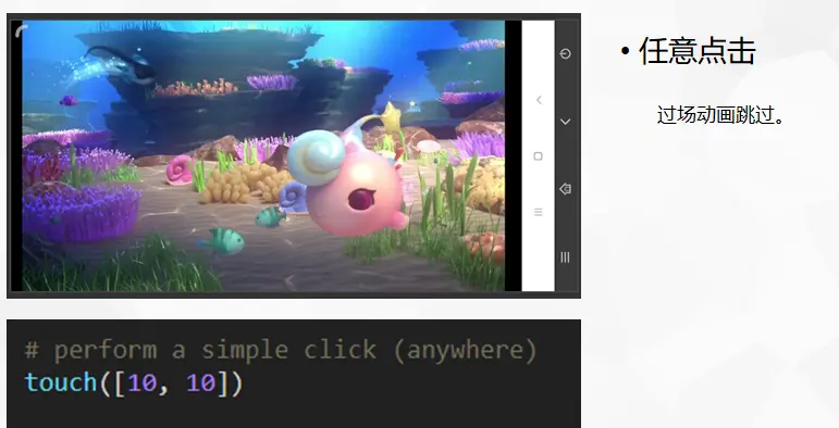 比如过场动画会很慢,我们可以选择跳过,这时就可以使用坐标进行设备操作。如下图的游戏过场动画: