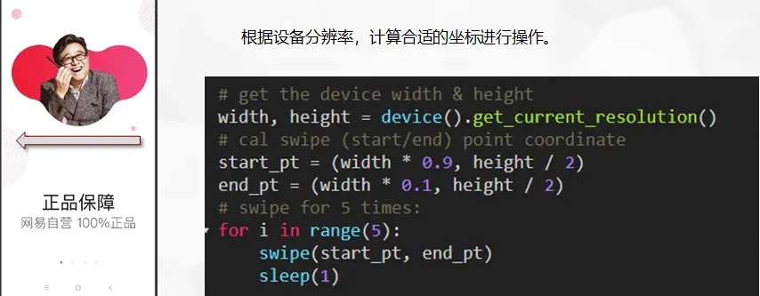 在考拉app打开后,有4个介绍页滑动后才能进去。如果通过airtest/poco的UI测试语句,需要运行半天。而通过直接使用固定坐标位置滑动,执行四下即可。要注意的是,这里坐标脚本的连续运行操作得太快,设备甚至有可能会反应不过来,一般每行语句后面需要加一下sleep(1.0),等待一下设备响应。