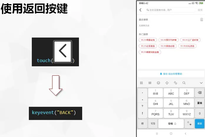 很多情况下,BACK按钮可以进行灵活使用。经常在点开一个页面,想返回上一个页面时,可以选择按UI按钮,但是一般keyevent(“BACK”)也可以达到目的,简单直接-兼容性又好。