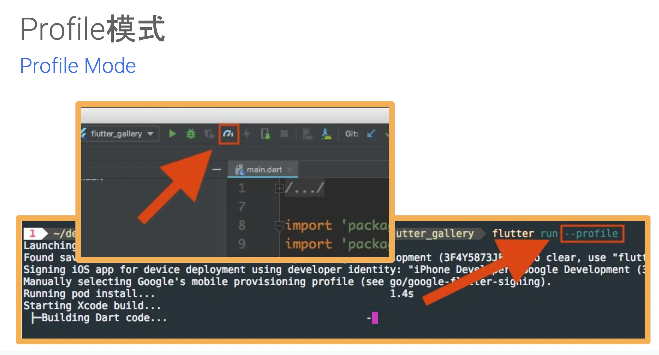 1.在 Android Studio 和 IntelliJ 使用 Run > Flutter Run main.dart in Profile Mode 选项