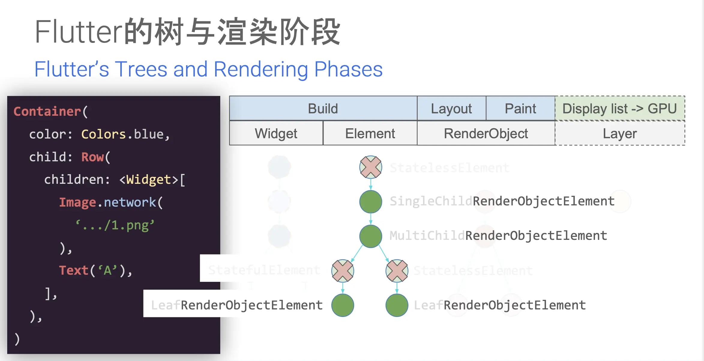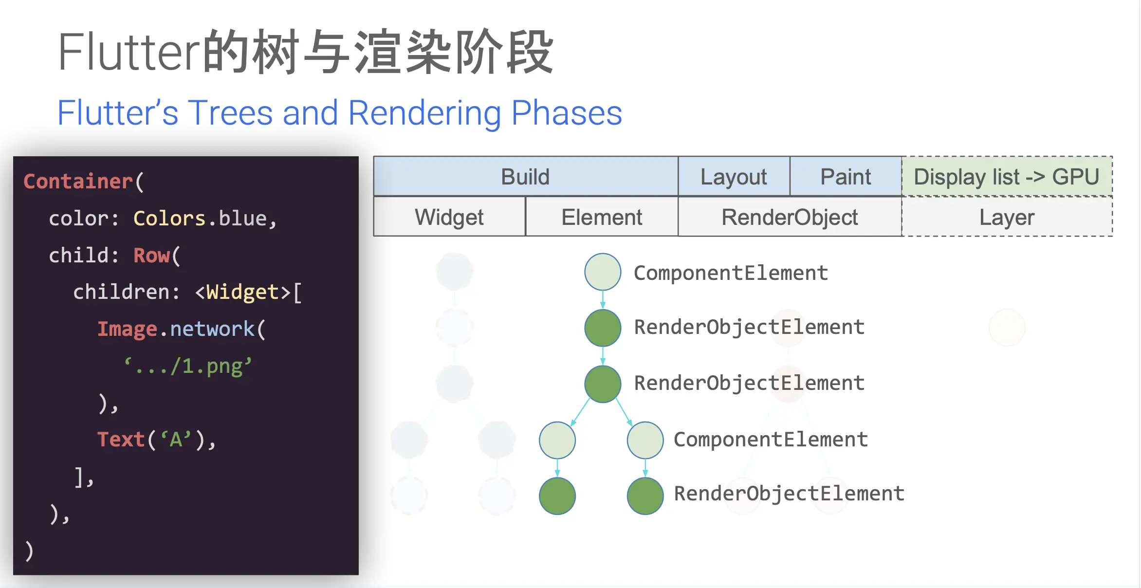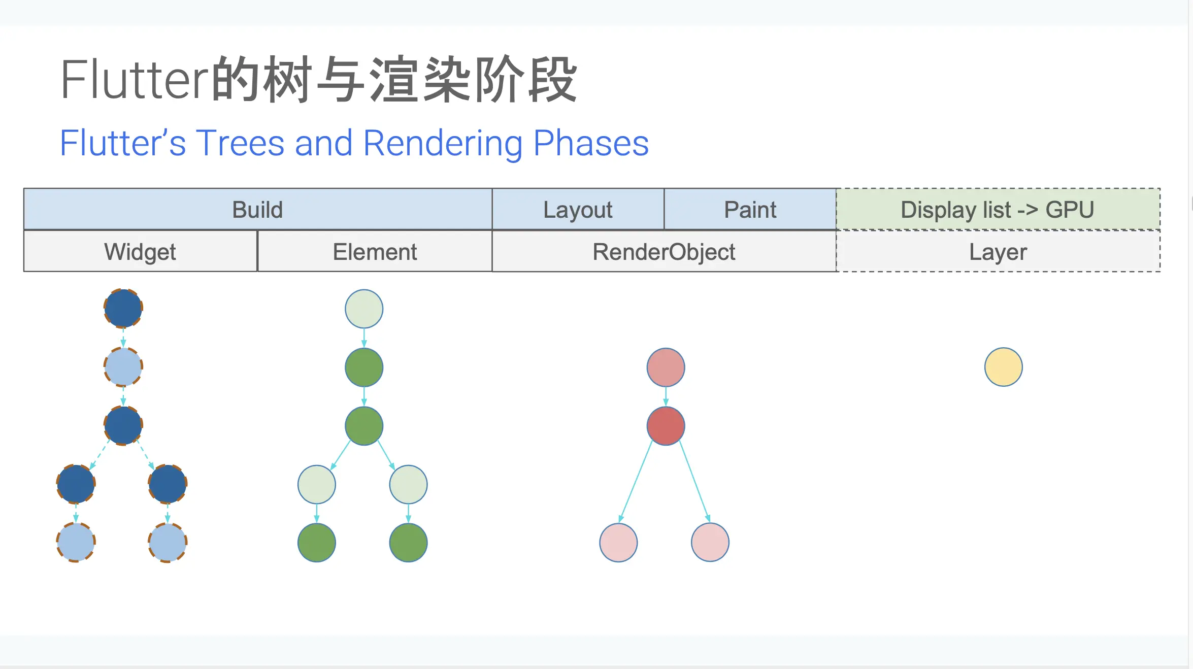 从创建到渲染的大体流程是:根据Widget生成Element,然后创建相应的RenderObject并关联到Element.renderObject属性上,最后再通过RenderObject来完成布局排列和绘制。
