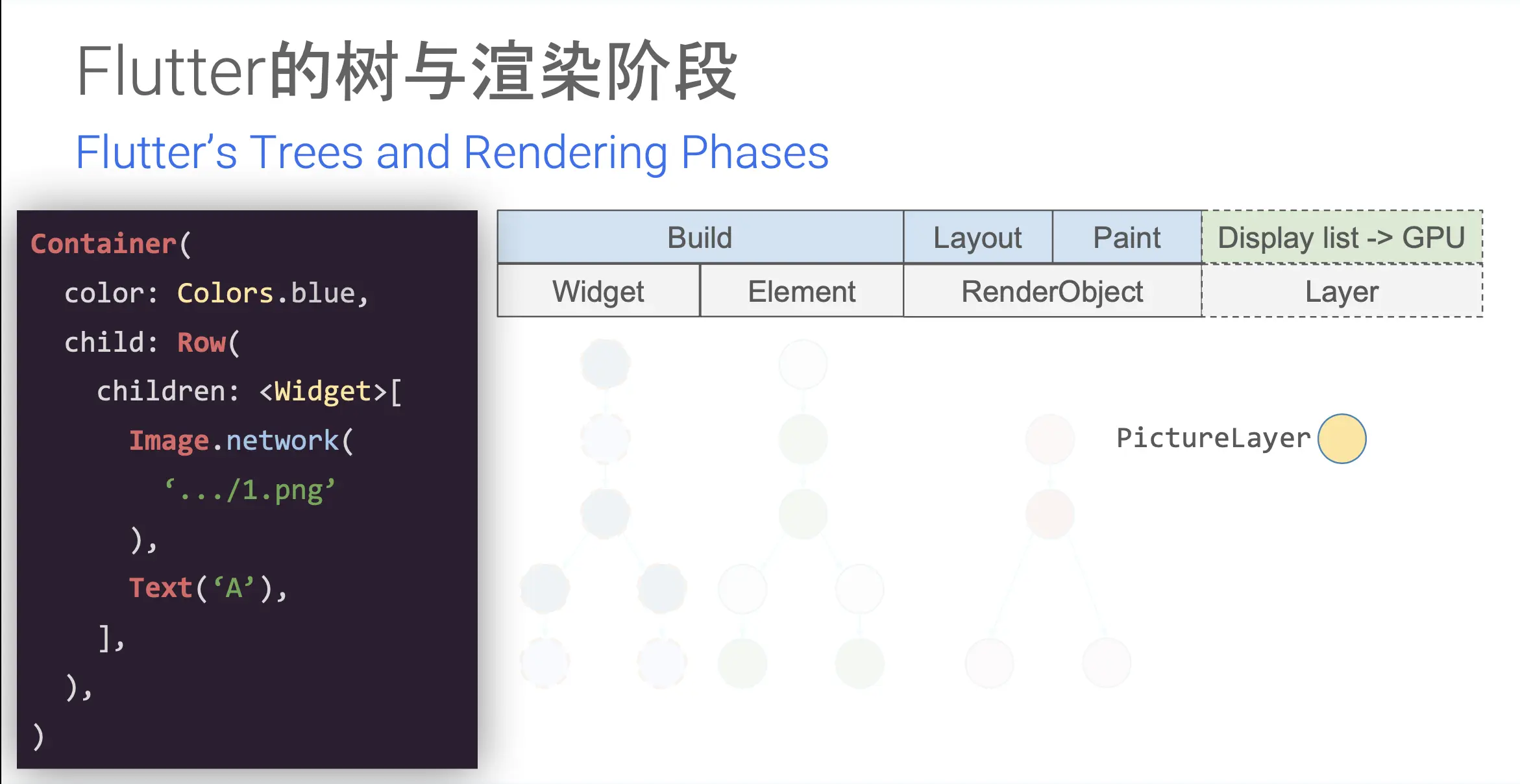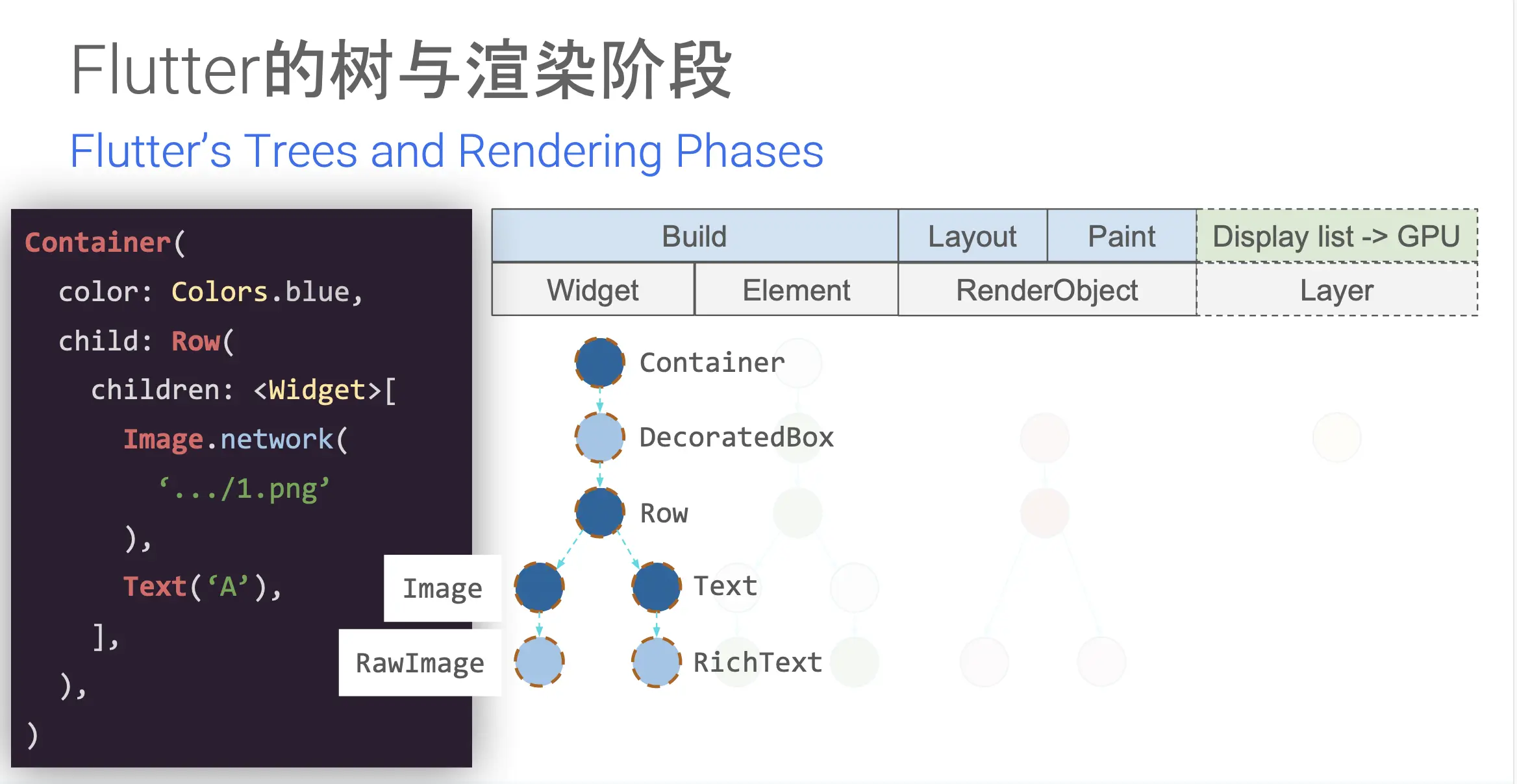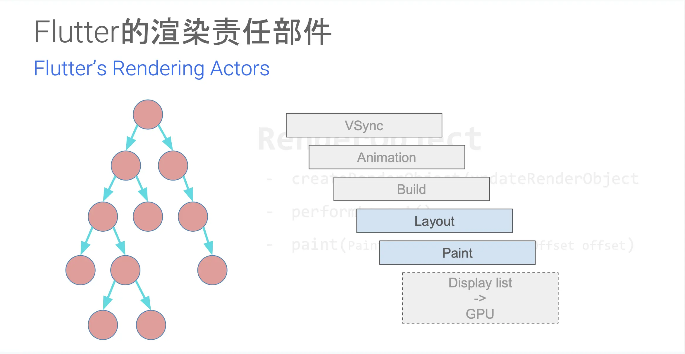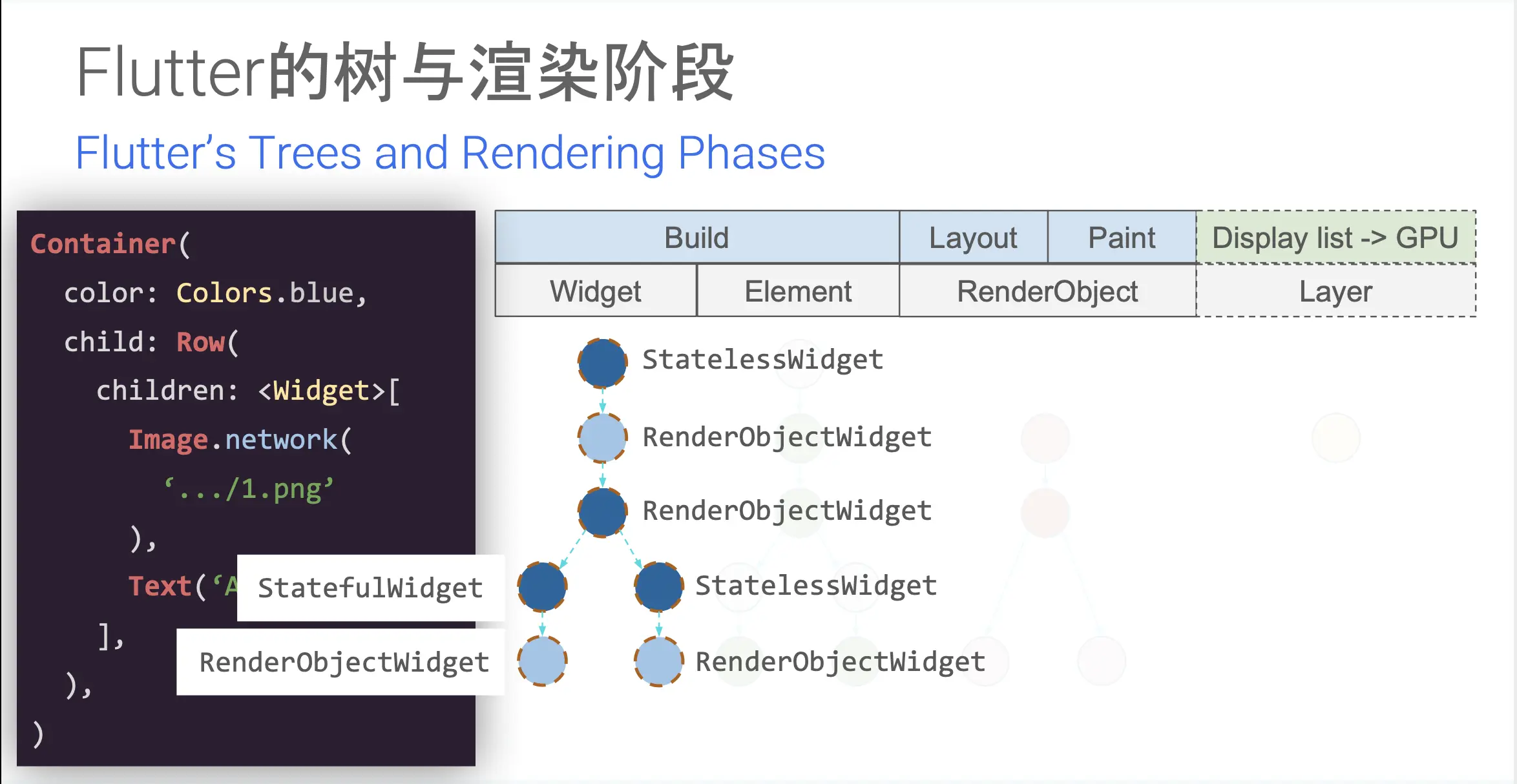 从创建到渲染的大体流程是:根据Widget生成Element,然后创建相应的RenderObject并关联到Element.renderObject属性上,最后再通过RenderObject来完成布局排列和绘制。