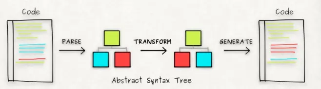 - 生成(Code Generation): 根据变换后的抽象语法树再生成代码字符串。