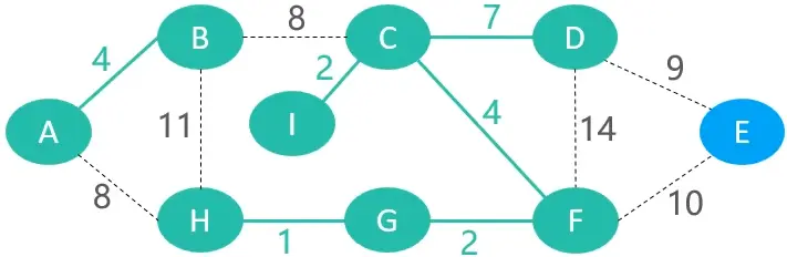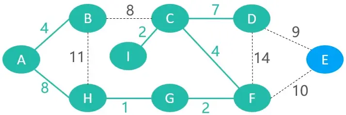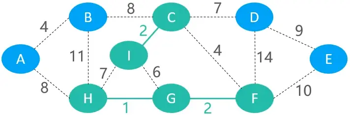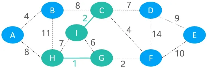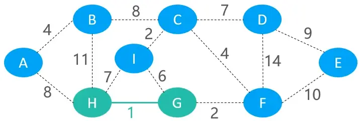 然后再从剩下的边中寻找一条边,由于前面已经排除了两条边,所以本次从8开始选择,由于现在有两条边的权值都为8,所以选择任意一条均可,在本示例中以选择AH边为例,最终选择后的结果如下