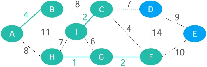 继续从剩下的边中,寻找权值最小的边,由于本次权值最小的边BC会导致生成树成环,所以不能选,所以最终选择的是权值为9的边DE,所以选择后的结果如下
