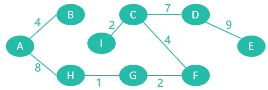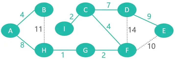 那就一次从小到大进行寻找,找到权值为7的边,不过请注意,权值为7的边IH一旦选择的话,也会导致生成树成环,所以依然不能选,所以最终选择的边是CD,所以选择后的结果如下