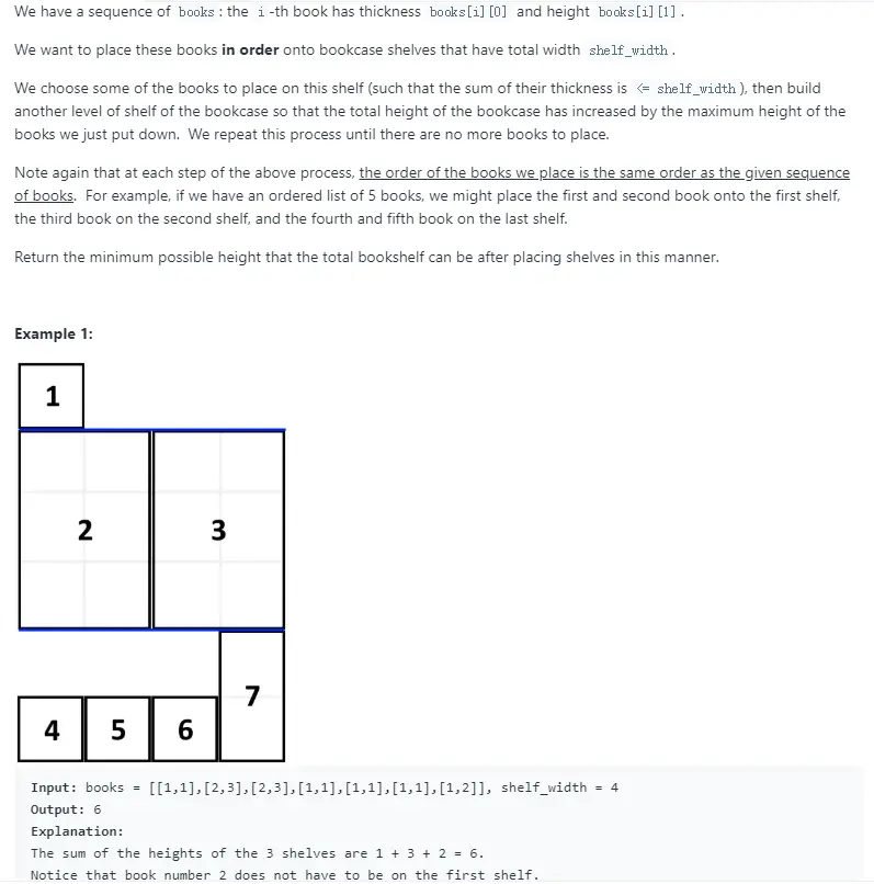 - 在满足当面width < shelf_width的情况下,计算dp[i] = min(dp[i],dp[j-1]+height)