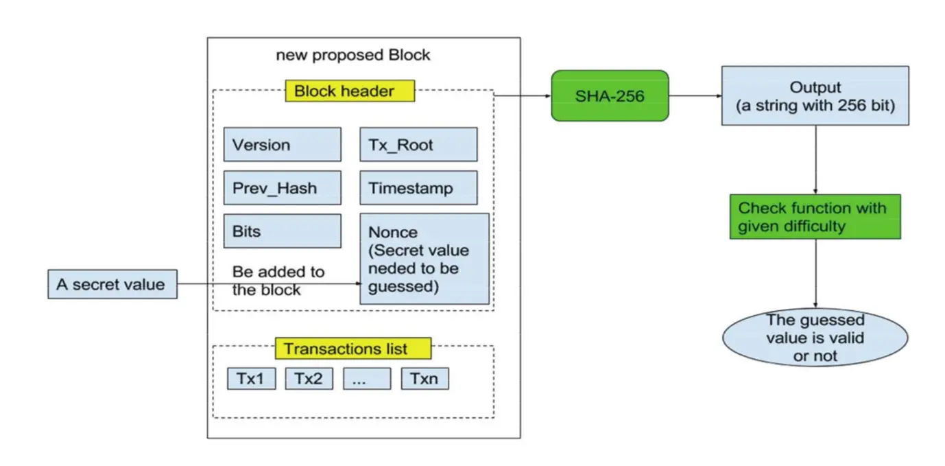如下图所示,节点/矿工将计算一个私有值。在猜出一个称为nonce的值后,通过SHA256的帮助完成散列,并以给定的困难级别来检查输出。如果散列值被接受,那么也可以正确地猜测nonce值,否则重复整个过程,即猜测另一个nonce值,直到找到正确的数。找出正确的nonce值之后,节点才可以广播其块散列值和nonce值到网络中的其他节点,以进行验证并将其附加到自己的账册中。从积极的角度来看,工作量的证明是高度安全的,而从消极的方面来看,其需要很高的计算能力。由于其缺点,权益证明和更多基于证明的共识算法得到了发展