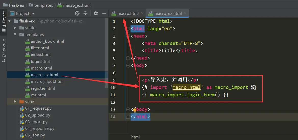 2.编写另一个html文件macro_ex.html,用来导入模板宏以及调用