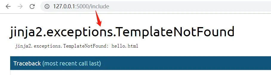 上面说到,如果包含的模板文件不存在,则会抛出异常TemplateNotFound,如下: