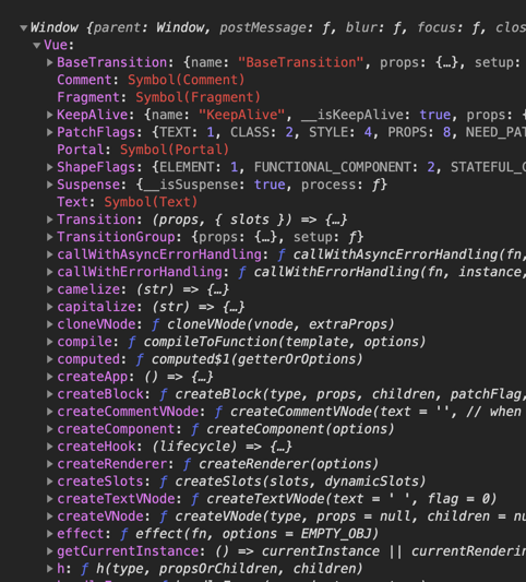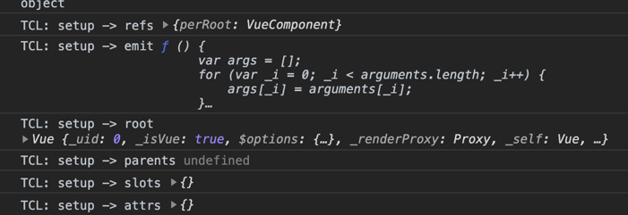 - 这个方法接收两个参数,props和context,并且顺序固定,顺序固定的原因是因为官方认为props的使用场景更多一些,附议!一个都认识,是接收父组件的值,第二个是上下文,用它替代this,也就是说在setup()函数中,可以访问this,但是不需要再访问this,打印的this长这样,访问到的是vue直接暴露出来的所有api!
