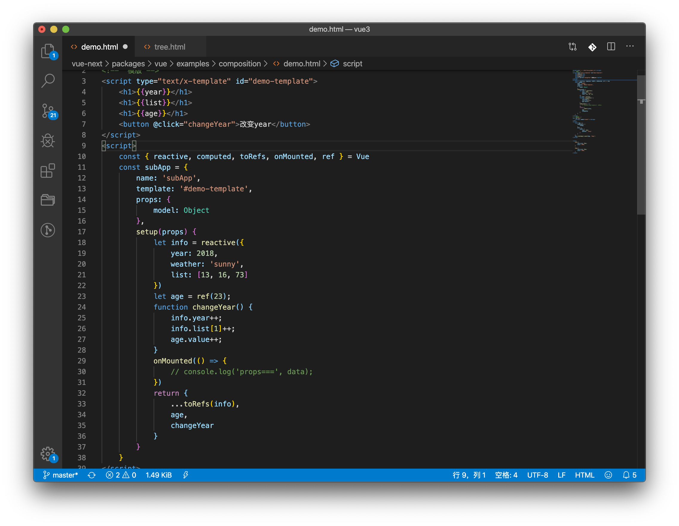 - clone下来,install 依赖后,build一下,然后run dev 就可以在/packages/vue/dist目录里找到编译好的vue,引入html后可以直接使用,下面是demo,感受一下新的api.