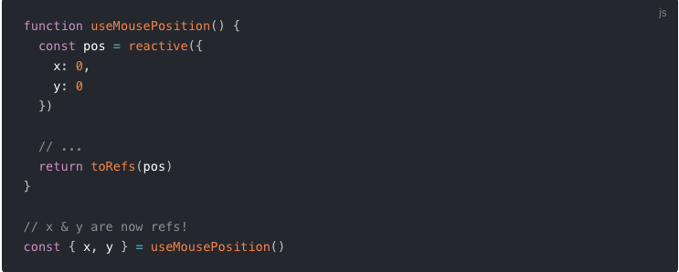- 还有一个问题, 就是当我们想要对响应式对象进行解构的时候,直接解构或者扩展会使响应式对象引用丢失,就丧失了响应式效果。官方提供了一个方法可以解决,toRefs,经过toRefs包装后,依然是响应式