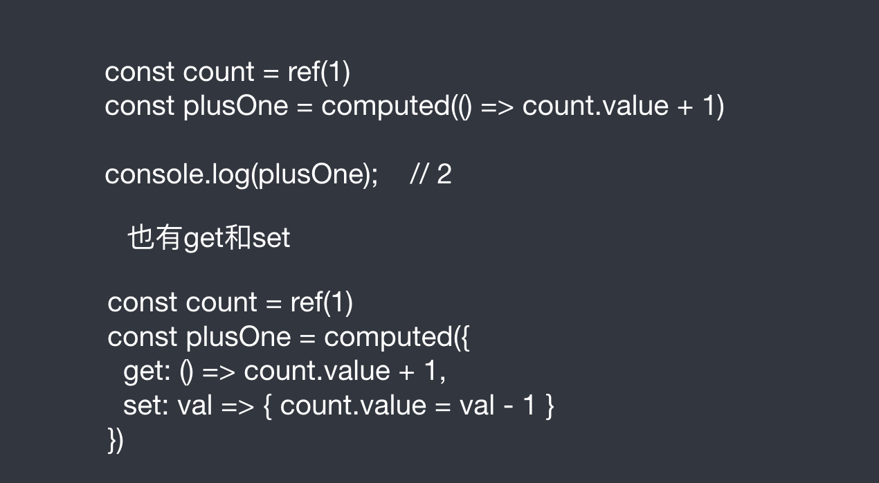 - computed的变化不大,效果也和vue2一样,只是写法上有些变化,从options变成了基于函数的方式。