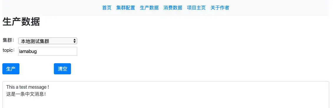 点击"生产数据",选择对应的集群,输入 topic 名称,然后在下方文本框中输入要生产的消息,一条或多条都可以: