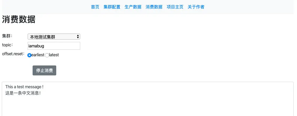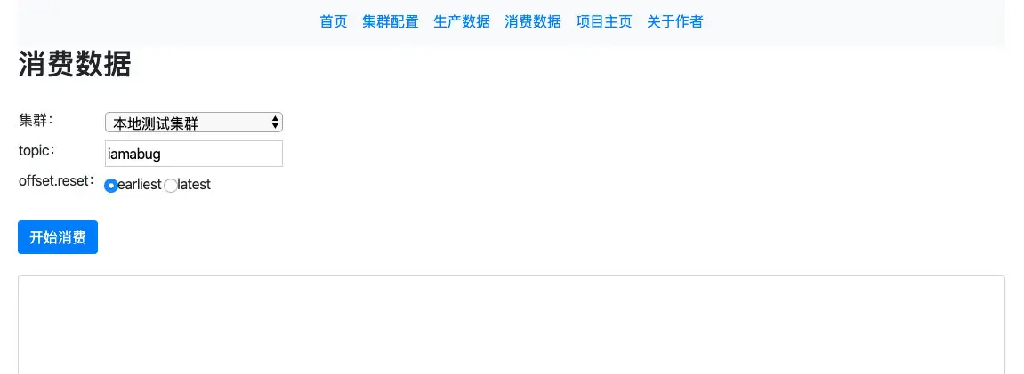 点击"消费数据",选择对应的集群,输入 topic 名称,选择 offset reset 的类型,earliest 从最老的数据消费,latest 从最新的数据消费: