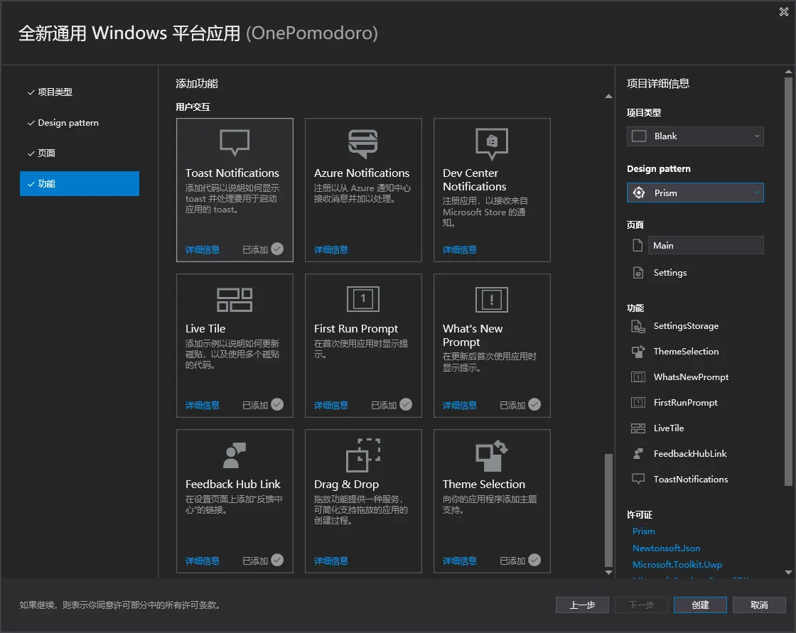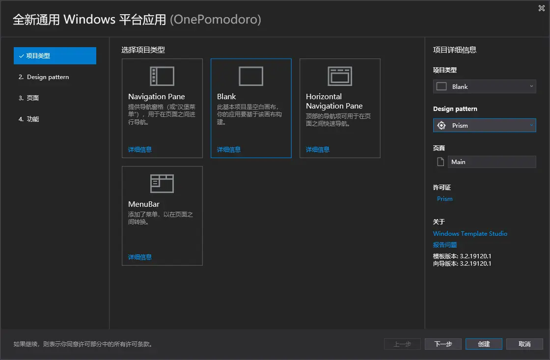 项目名称是OnePomodoro,项目类型选择Blank,Design pattern选择了Prism,因为在WPF中用惯了Prsim。不过我不懂UWP中Prism怎么用,所以我也没打算马上就用,只是个小项目轻轻松松地CodeBehind一把梭。