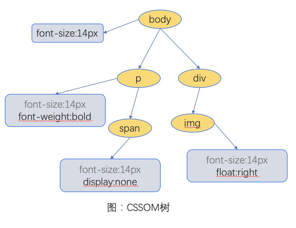 - 解析完成后,开始确定每个节点的样式,最终转化为 CSSOM 树,这一过程比较消耗资源,因为这一过程是递归 CSSOM 树的,并且建议书写 CSS 时减少使用关系型选择器。解析完成后生成如下 CSSOM 树。