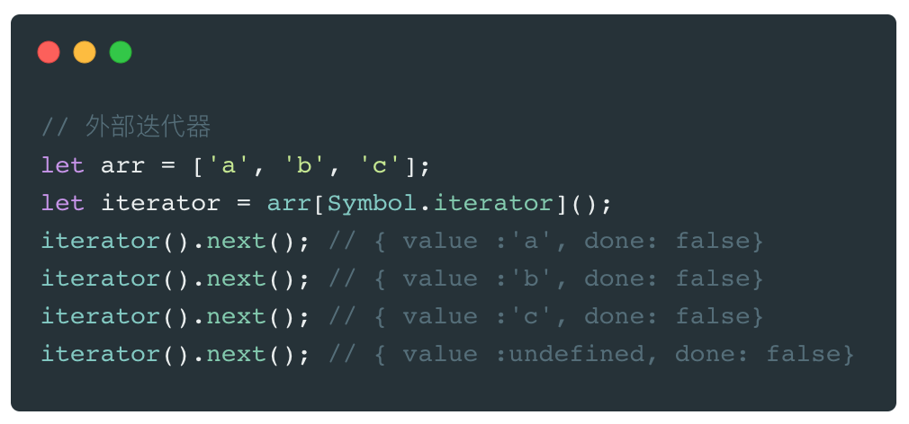 内部迭代即调用一次循环所有元素,外部迭代需要手动触发下一个元素的迭代,如图: