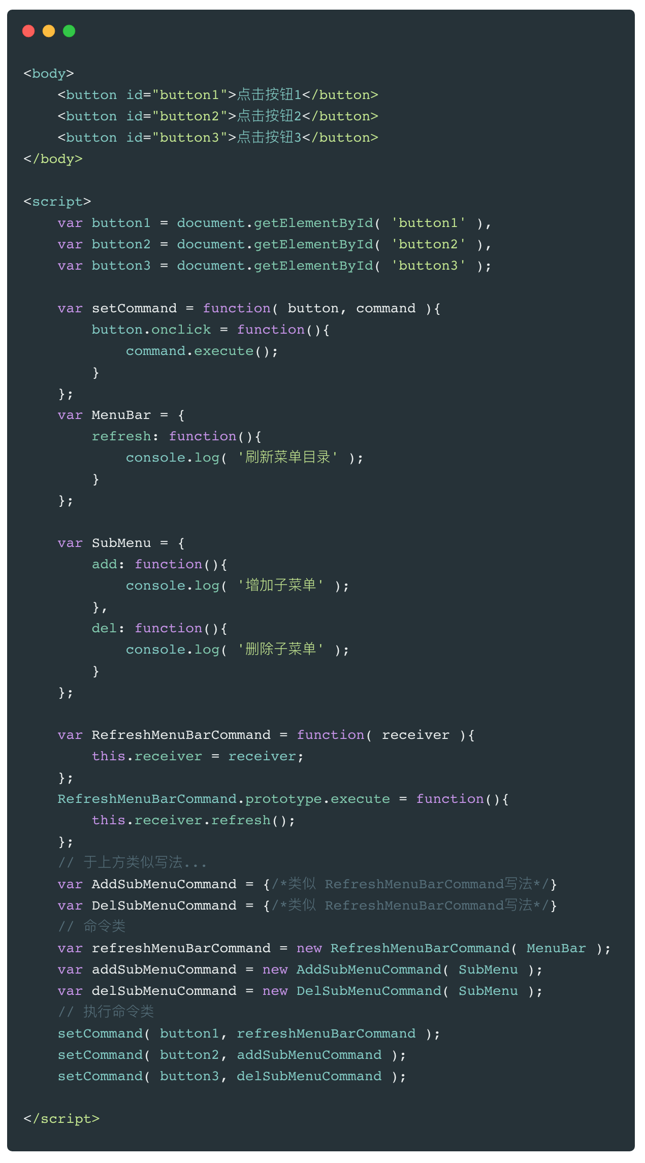 命令模式的由来其实是回调(callback)函数的一个面向对象的替代品,跟许多其他语言不同,JavaScript 可以用高阶函数方便地实现命令模式。