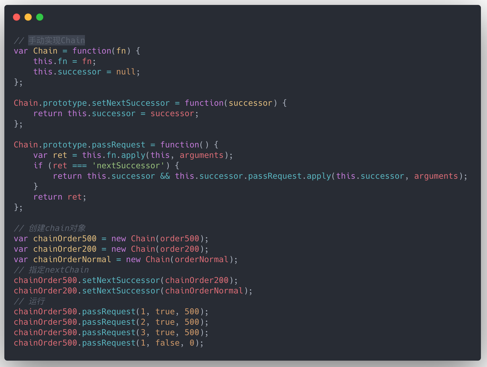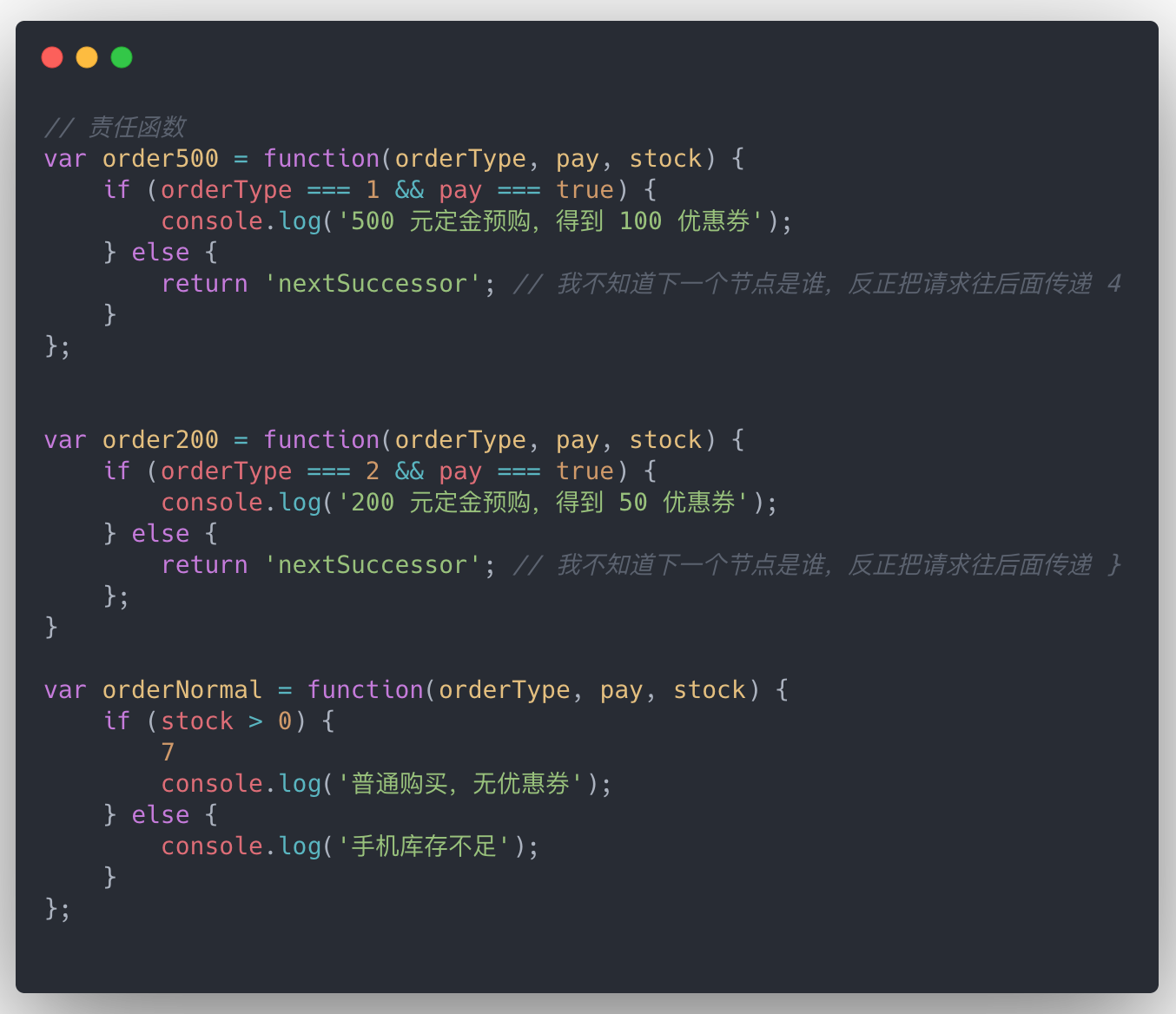 在 JavaScript 开发中,职责链模式是最容易被忽视的模式之一。只要运用得当,可以降低发起请求的对象和处理请求对象之间的耦合性,可以自由变化职责链中的节点数量和顺序。