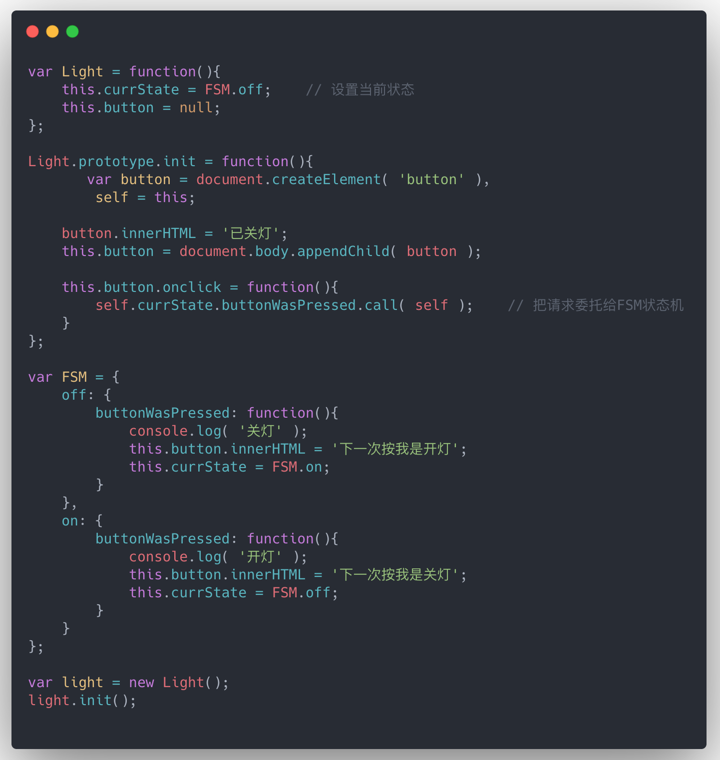 状态模式的关键是区分事物的内部状态,事物状态的改变会带来事物行为的改变,每种状态都封装成单独的类,跟此种状态有关的行为都被封装在这个类的内部,当请求对象的某个行为时,把这个请求委托给当前的状态对象的行为即可。