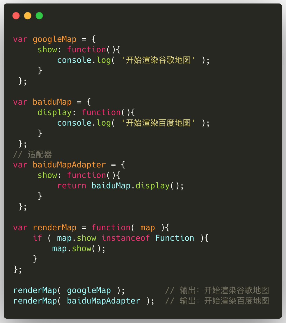 当我们试图调用模块或者对象的某个接口时,发现这个接口的格式并不符合目前的需求时, 创建一个适配器,将原接口转换为客户希望的另一个接口,客户只需要和适配器打交道。 使用适配器模式之后,原本由于接口不兼容而不能工作的两个软件实体可以一起工作。